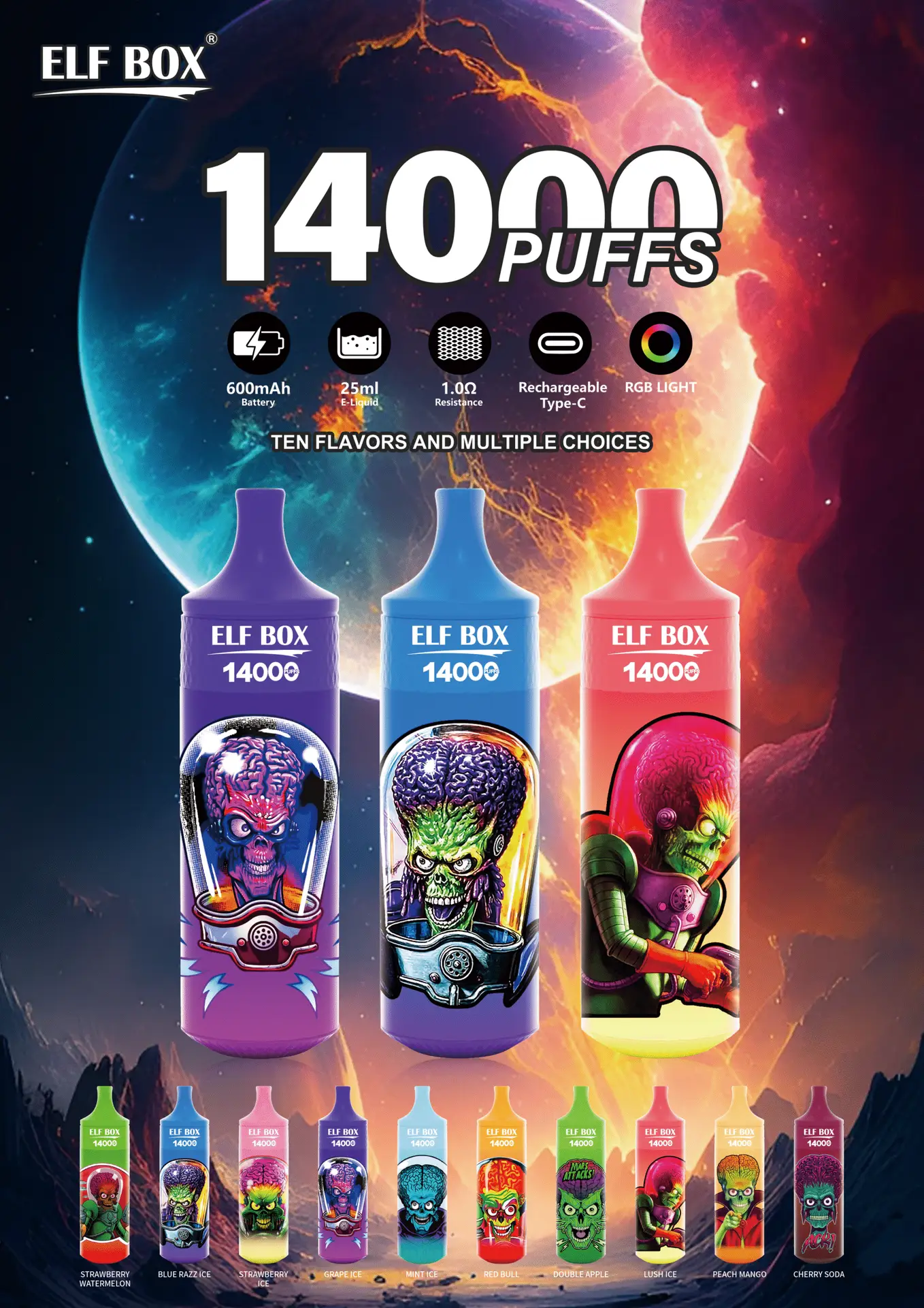 A6: The ELF BOX RGB 14000pro comes in 10 vibrant flavors, including Strawberry Watermelon, Blue Razz Ice, Mint Ice, and more.