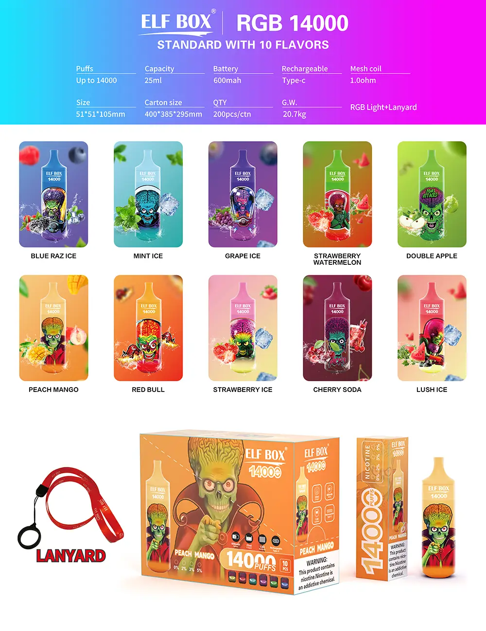 With its compact design and ergonomic shape, the ELF BOX RGB 14000pro is perfect for MTL vaping, and its vibrant flavors guarantee an enjoyable vaping experience.