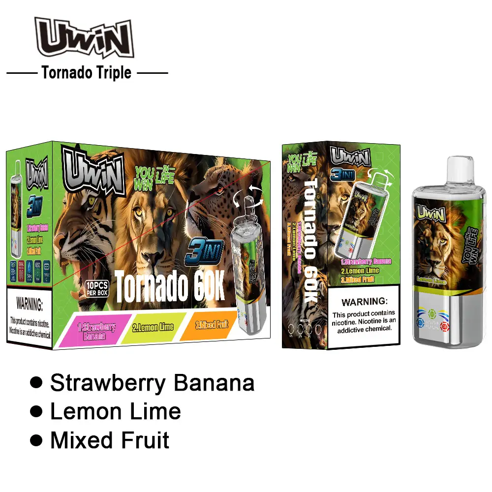 Uwin 60K disposable vape delivers 60000 puffs with a triple-flavor switch system, 3 e-liquid tanks, and arechargeable 650mAh Type-C battery. Featuring dual mesh coil technology and a smart screen display, it’s designed for vapers who want big puff performance and multiple flavors in one device.