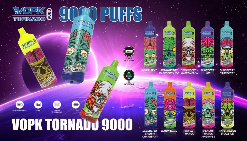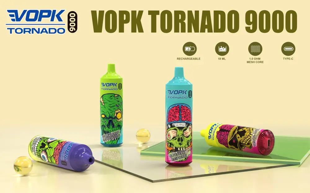 VOPK TORNADO 9K is a high-performance disposable vape pen designed for vapers seeking long-lasting flavor in a compact design. Featuring dual mesh coils (0.9Ω + 0.9Ω) and 18ml e-liquid, it delivers smooth, consistent clouds and a satisfying vaping experience.